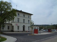 zum historischen Bahnhofsgebäude drei Bushaltestellen angeordnet.