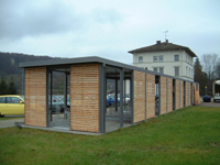 Laubbäumen überstellt. Die Fahrradhalle, eine Holz-Stahl-Konstruktion,