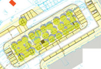 Die Parkplätze wurden entlang der, an den Fassaden vorbeiführenden,
